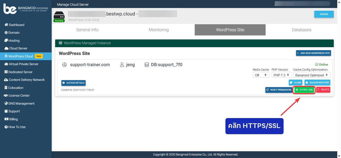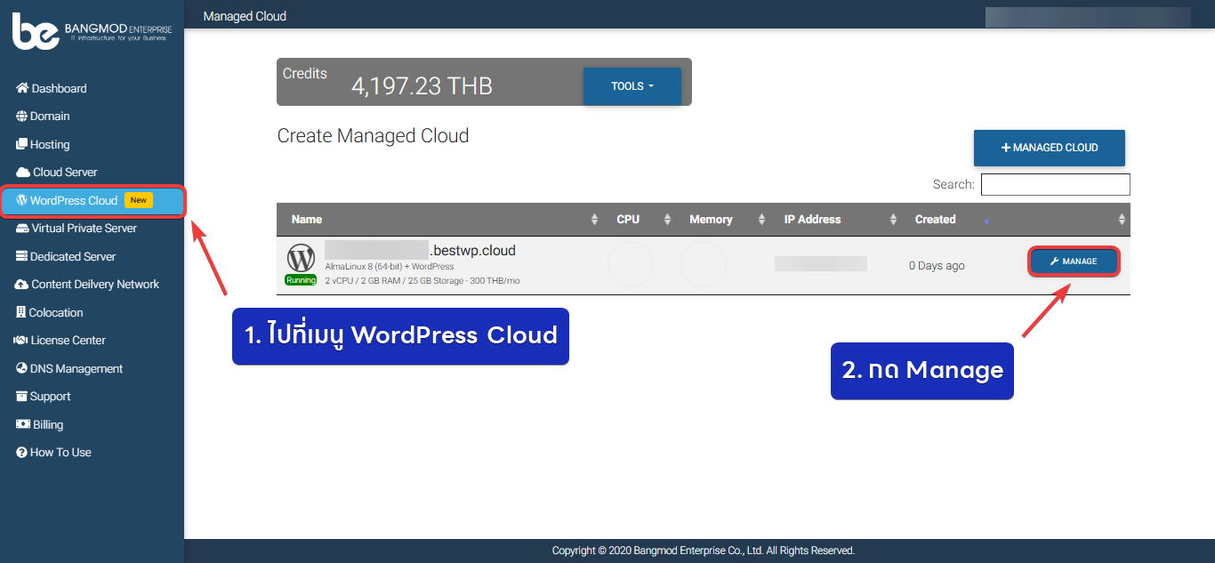 - เลือก WordPress Cloud ที่ต้องการเปิดใช้งาน SSL หลังจากนั้นกดปุ่ม MANAGE ที่เครื่องที่ต้องการจะติดตั้ง SSL