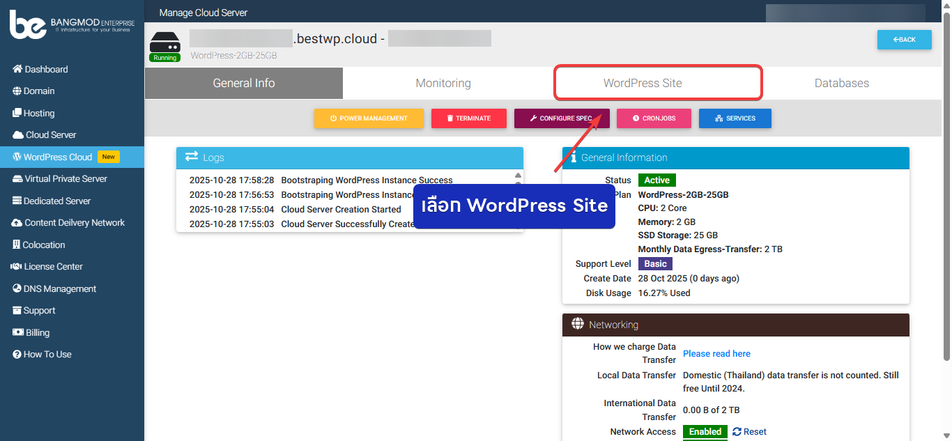 - กดที่เมนู WordPress Cloud เพื่อดูรายการ WordPress Cloud ที่มีอยู่
