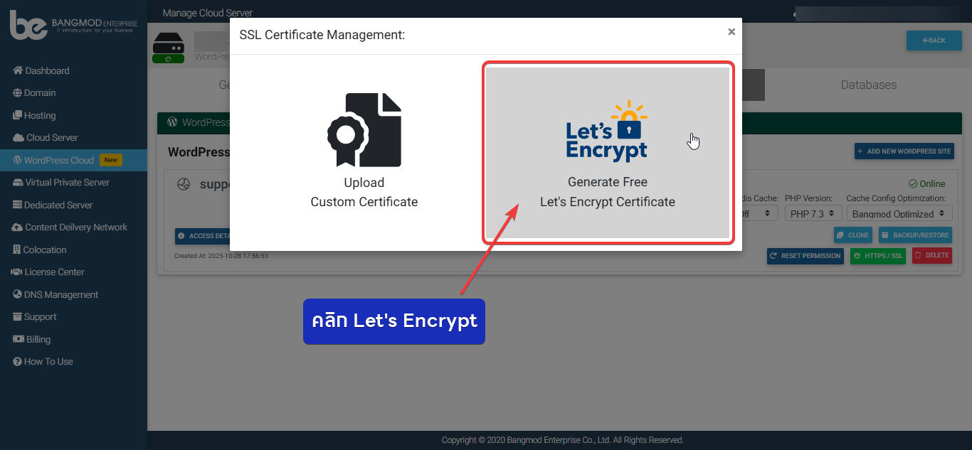 5. เลือก Let’s Encrypt เพื่อติดตั้ง SSL ให้กับเว็บไซต์ของเรา