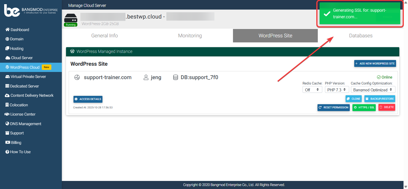 6. หากมีป๊อปอัพแสดงการแจ้งเตือนว่า “Generating SSL for ชื่อโดเมน” แสดงว่าระบบได้ติดตั้ง SSL ให้เราเรียบร้อยแล้ว