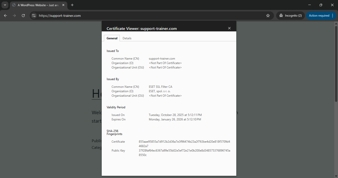- ถ้ามี SSL ถูกติดตั้งและทำงานถูกต้อง จะเห็น กุญแจสีเขียวหรือ HTTPS ขึ้นตรงหน้าเบราว์เซอร์