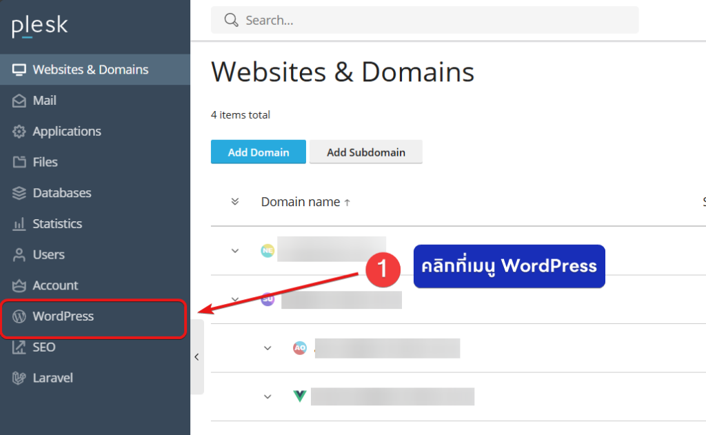 1. เข้าสู่ระบบ Plesk Control Panel และคลิกที่เมนู WordPress (1)