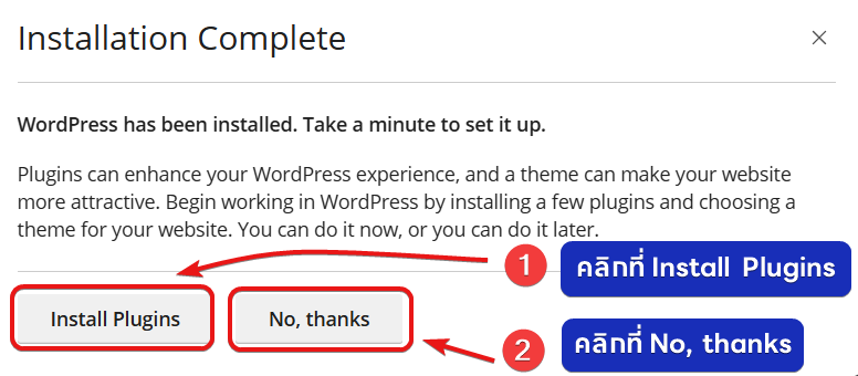 2. หรือหากท่านไม่ต้องการติดตั้งปลั๊กอินเสริม สามารถกดเลือกที่ No, thanks (2) ได้เลยครับ