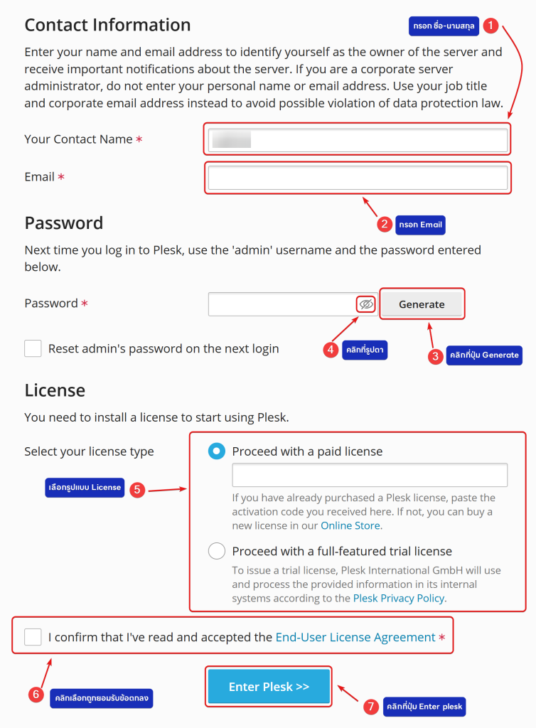 • Process with a paid license: ให้ระบุ License หากได้ดำเนินการสั่งซื้อ License แล้ว ซึ่งสามารถสั่งซื้อ License ราคาพิเศษได้ที่ https://bangmod.cloud/plesk-license