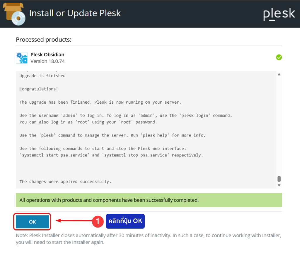 6. รอจนกว่าจะดำเนินการ Update Version เสร็จ เมื่อ Update เสร็จให้ดำเนินการคลิกที่ปุ่ม OK (1)