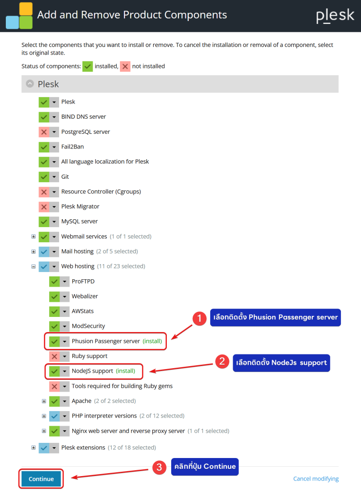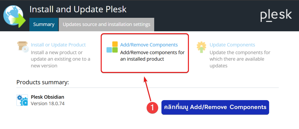 7. หลังจาก Update Version ของ Plesk เรียบร้อยแล้ว ให้เลือก Add/Remove Components (1)