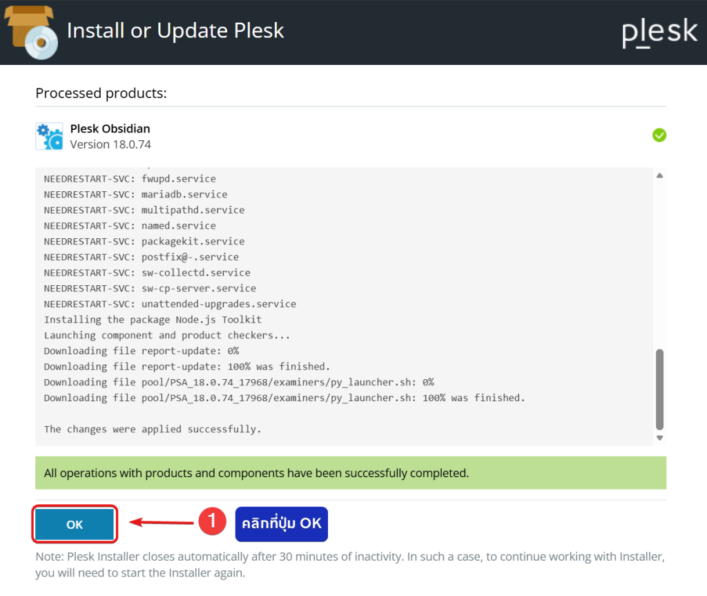 9. ให้รอจนกว่าจะดำเนินการติดตั้ง Phusion Passenger server และ NodeJs support เสร็จ เมื่อติดตั้งเสร็จให้ดำเนินการคลิกที่ปุ่ม OK (1)