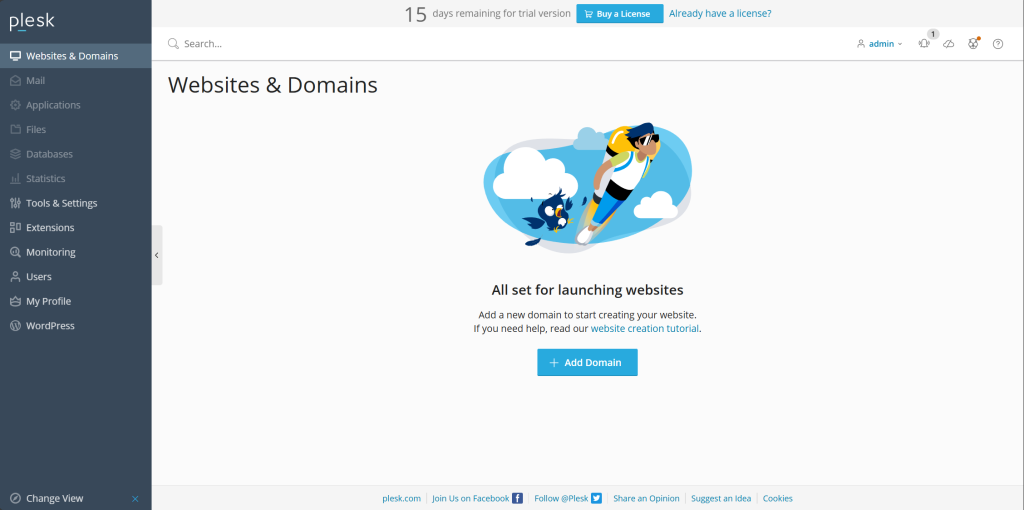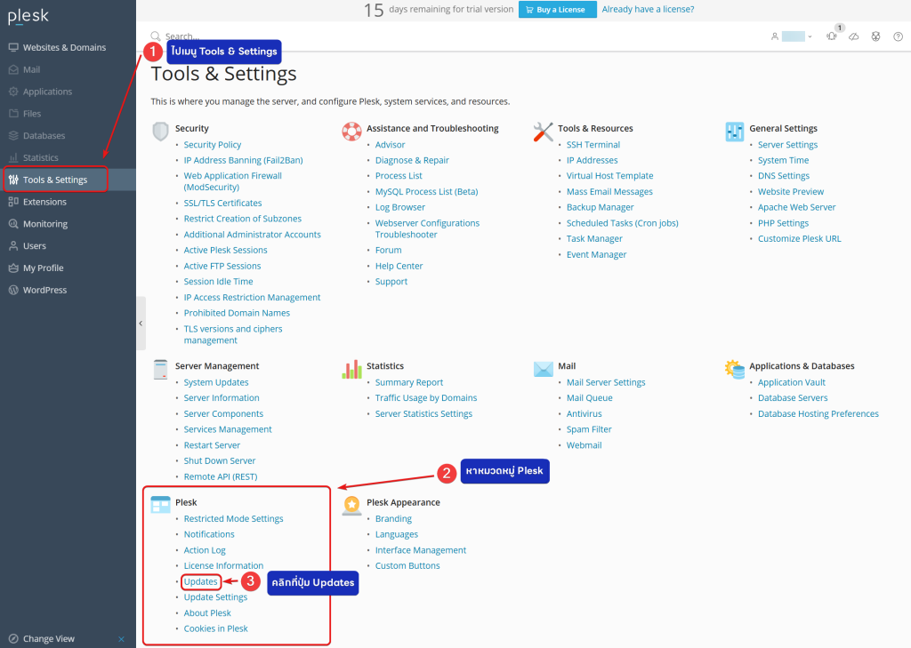 2. หลังจากที่เข้าหน้าการจัดการ Control Panel Plesk แล้ว จะมีแทบต่าง ๆ อยู่ด้านซ้ายของจอ