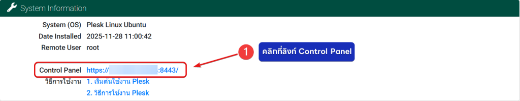 1. หลังจากได้ทำการสร้าง Manage Cloud Server Plesk ให้ดำเนินการเข้าหน้า Control Panel ตามที่ได้รับลิงก์ทางอีเมล หรือที่แสดงอยู่บนหน้าจัดการ Cloud Server ดังภาพตัวอย่างด้านล่าง หลังจากนั้นให้คลิกเข้าลิงก์ Control Panel (1)