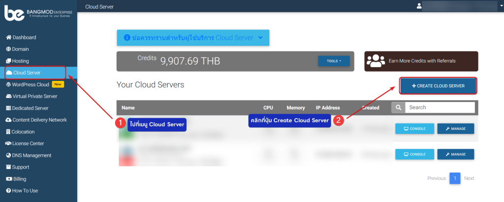 2. คลิกที่ปุ่ม Create Cloud Server เพื่อสร้าง Cloud Server