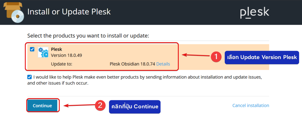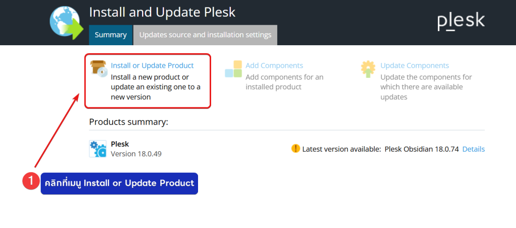 4. หลังจากกด Updates จะแสดงหน้าสำหรับ “Install and Update Plesk” ให้คลิกที่เมนู Install or Update Product (1)