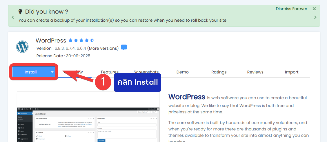 - เลือกเวอร์ชัน ของ WordPress ที่ต้องการติดตั้ง
