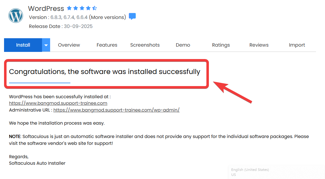 เมื่อระบบติดตั้ง WordPress เสร็จแล้ว จะแสดงข้อความ “Congratulations, the software was installed successfully”
